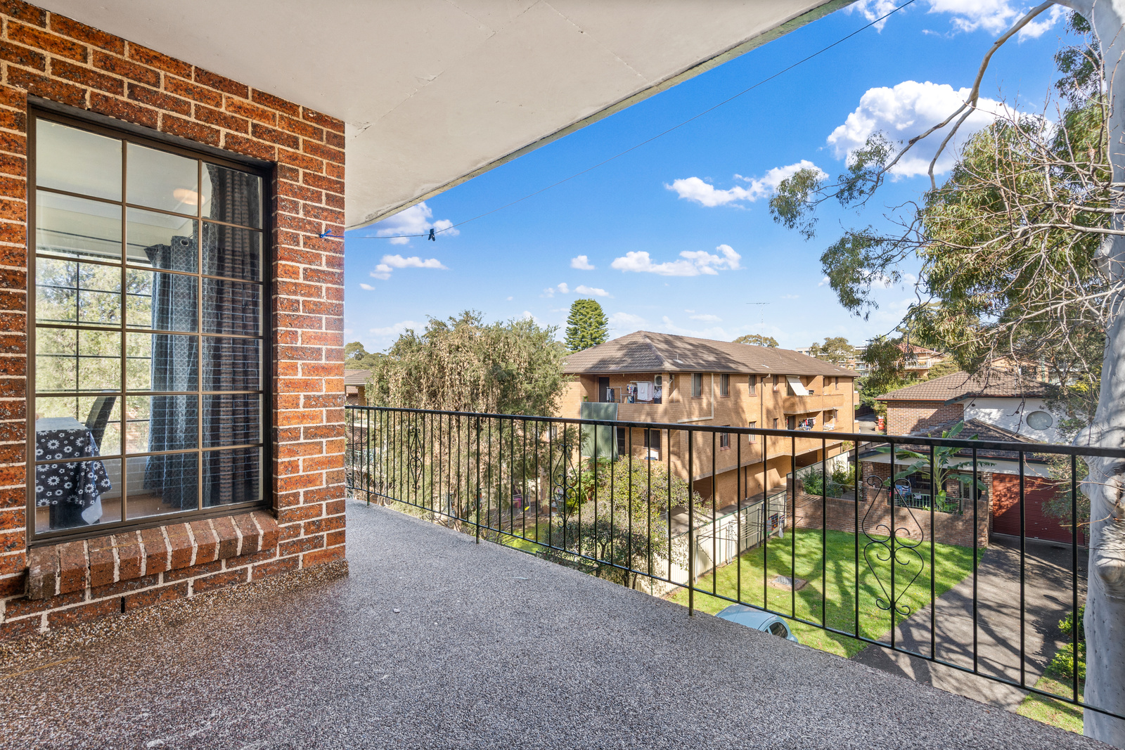 • The spacious living room seamlessly connects to a large balcony, boasting an idyllic leafy outlook.