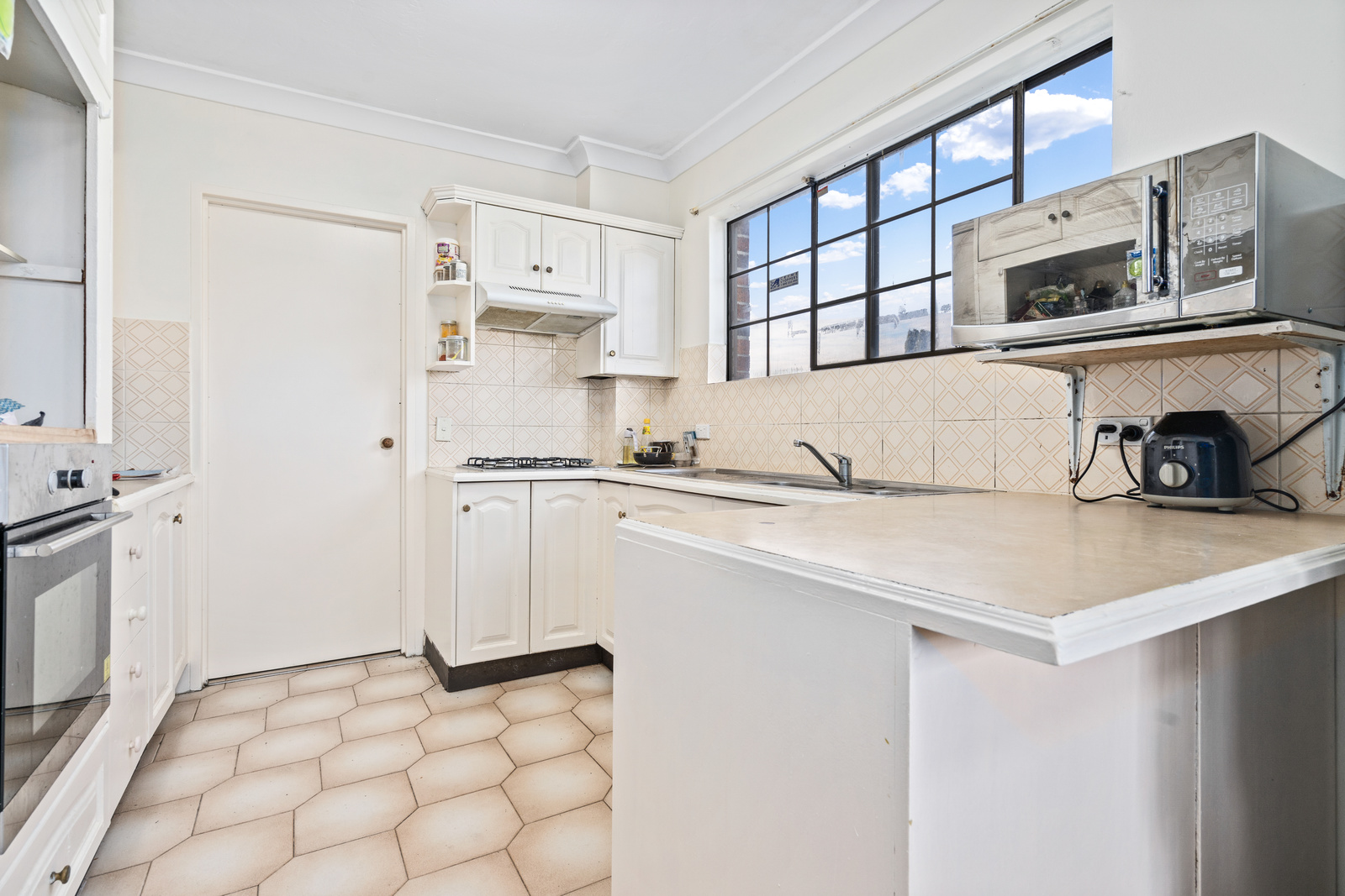 • Well-equipped kitchen with more than ample cupboard space, gas cook-top, electric oven, and dishwasher.
