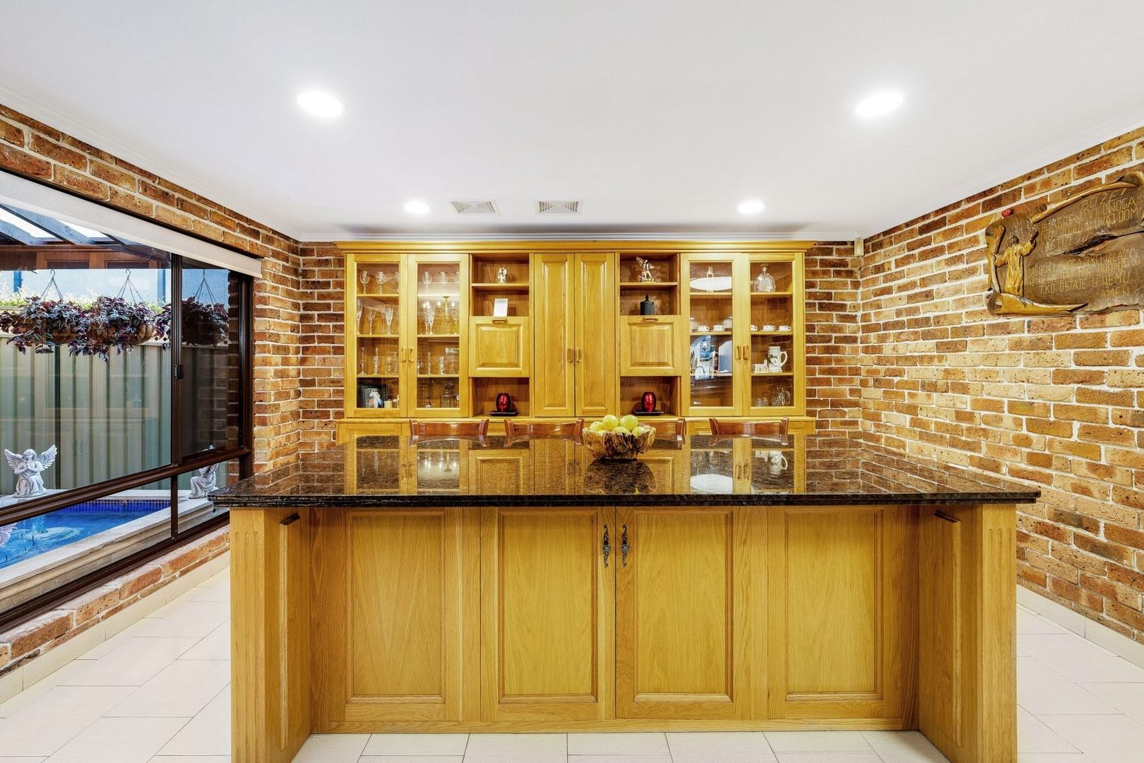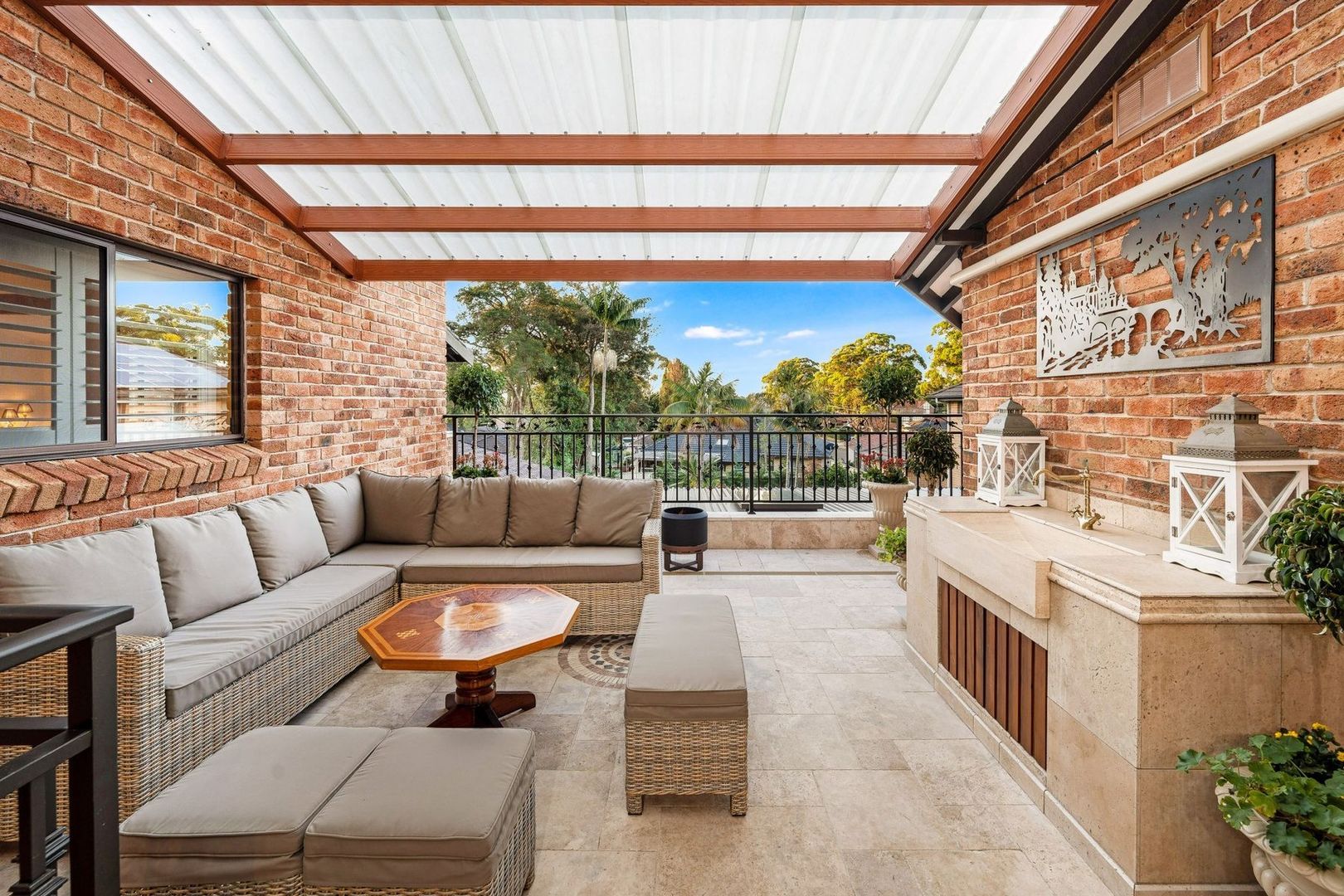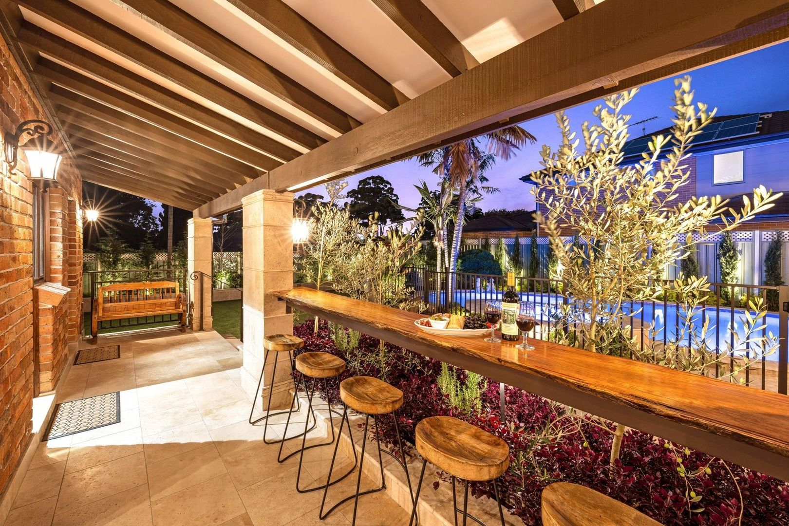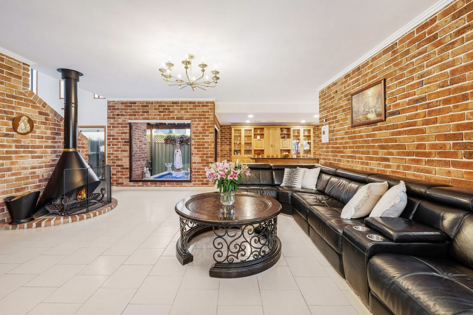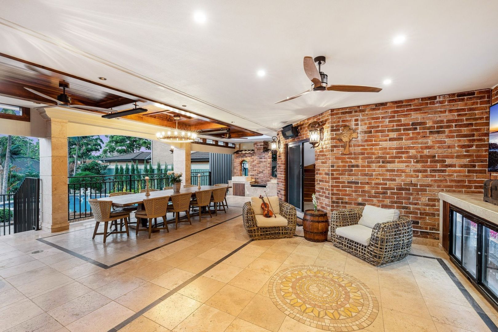 - Covered outdoor entertaining area overlooking the pool with built in charcoal BBQ, stone sink, fridge, gas burner, fans, heaters and cabinetry