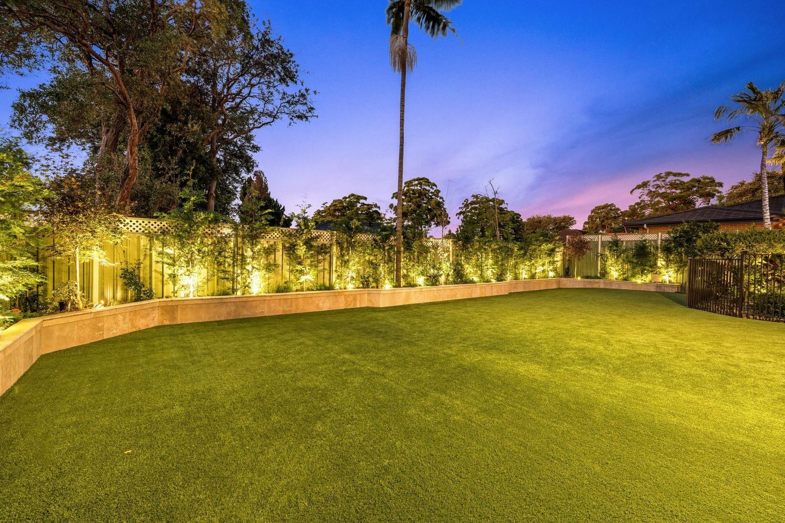 - North-facing backyard featuring maintenance free synthetic grass with a variety of trees including Maple and Olive