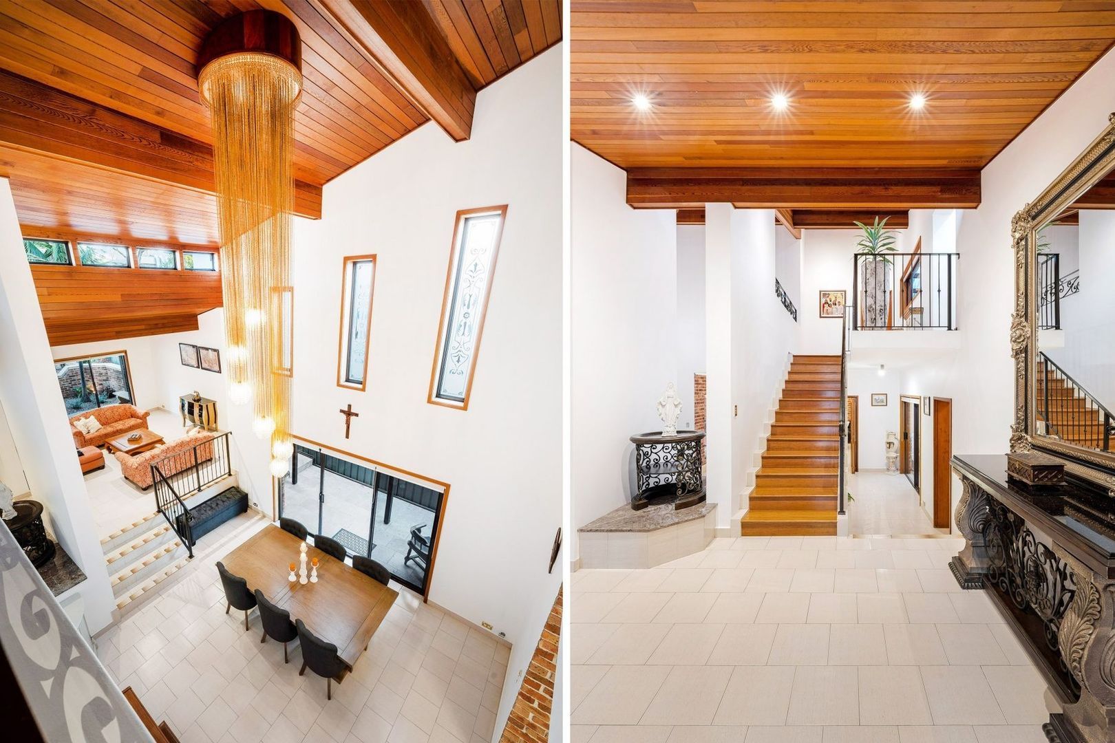 - Spacious formal living, dining and entry foyer with cedar lined cathedral ceilings
