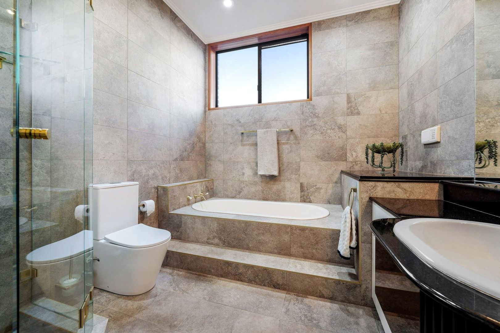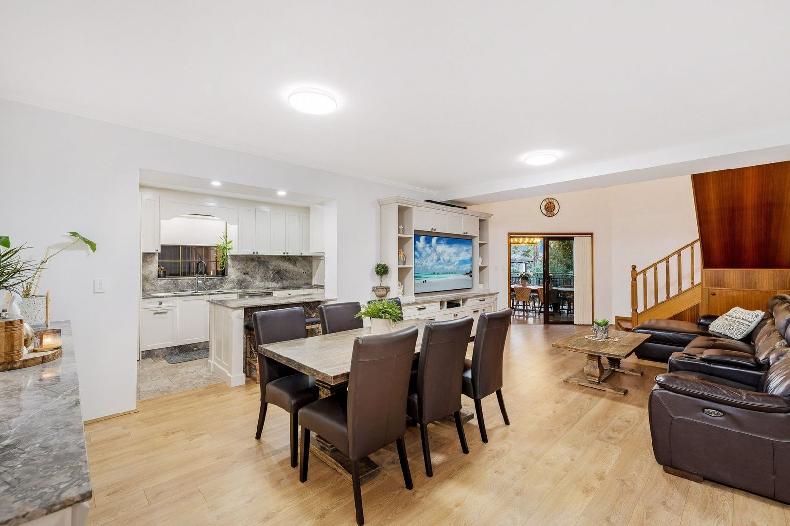 - Quality eat-in kitchen overlooking the outdoor entertaining area, with Tasmanian Oak cabinetry and stone benchtops