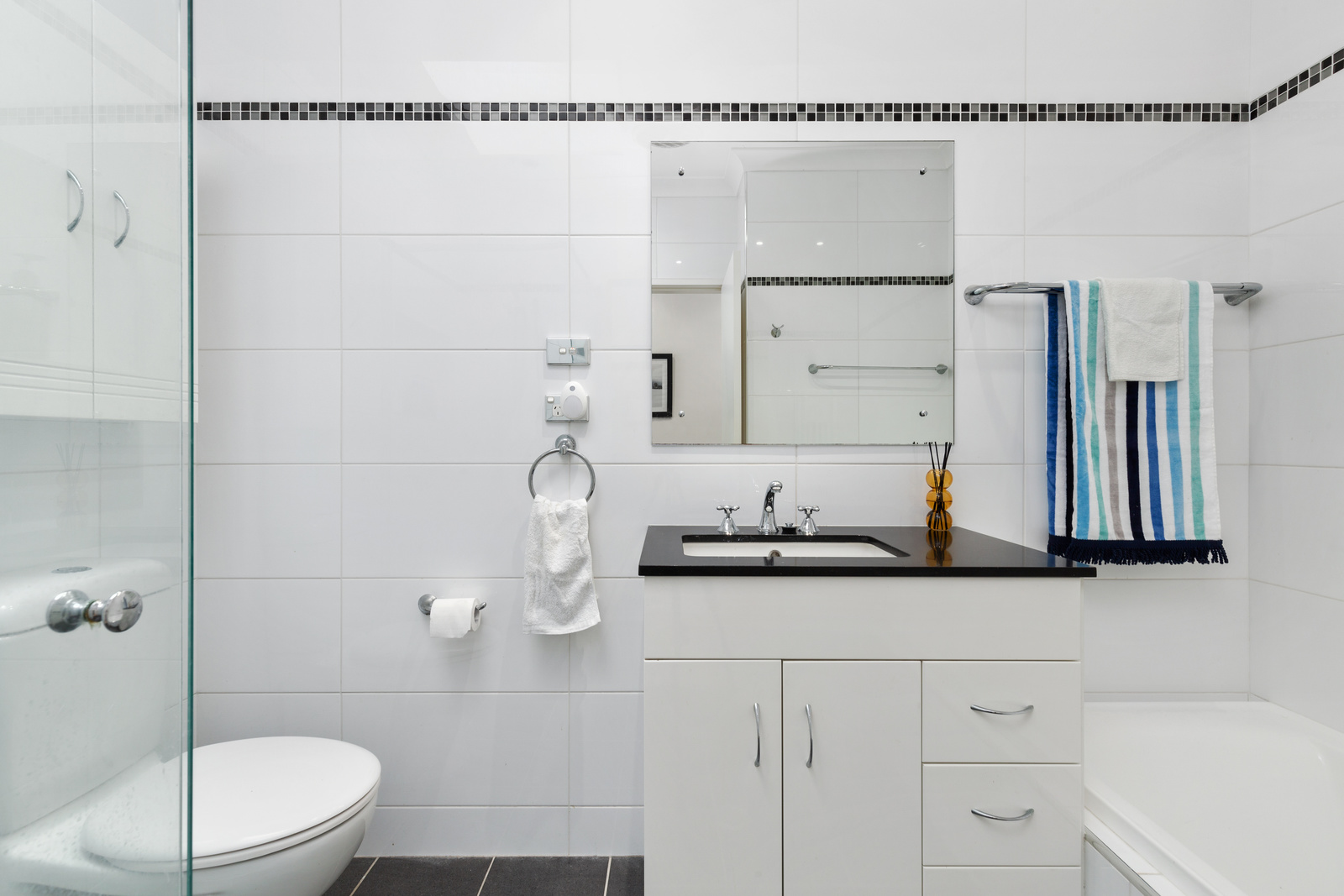 The well-appointed bathroom, adorned with floor-to-ceiling tiles, offers both a shower and a bath, while an additional toilet within the separate laundry.
