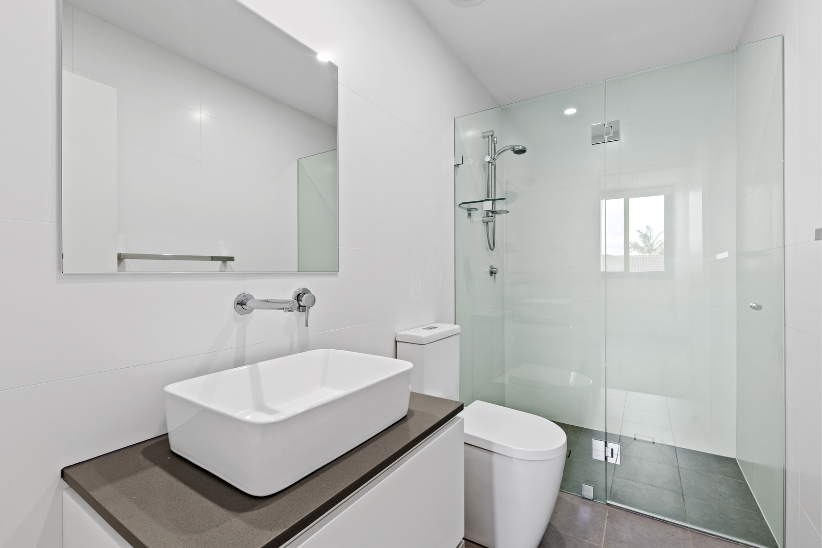 The main bathroom is spacious, adorned with floor-to-ceiling tiles and sleek finishes.