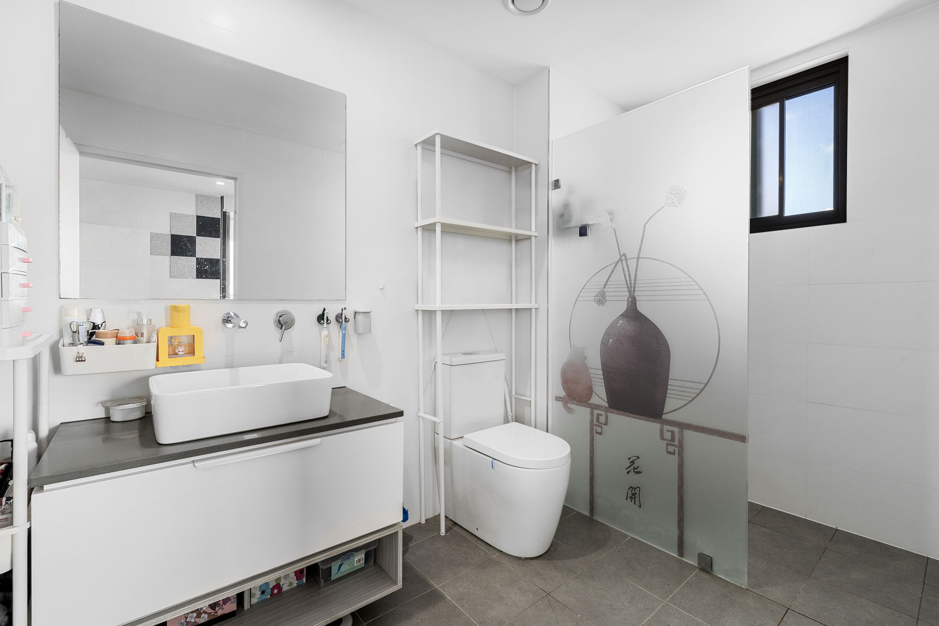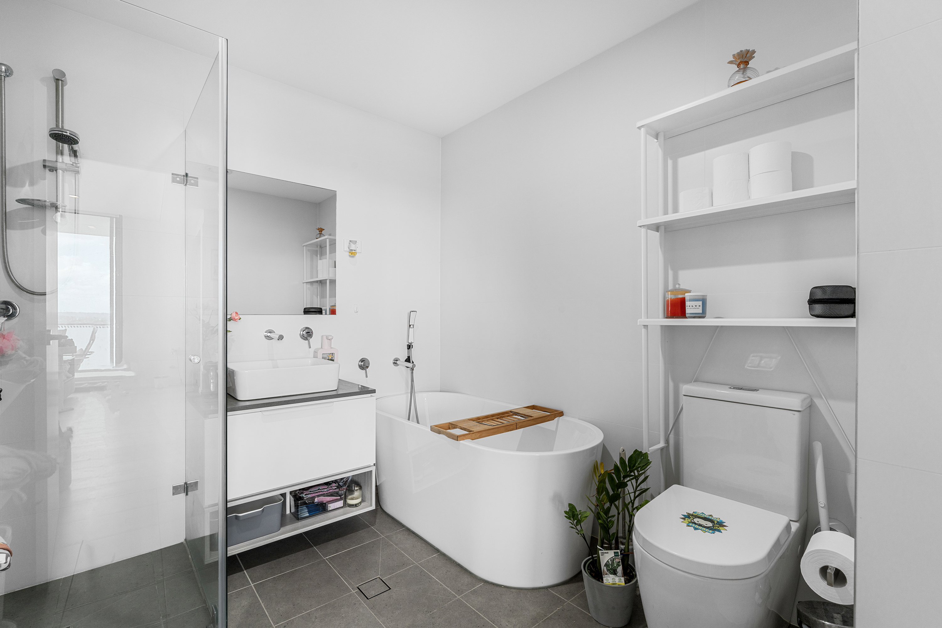 • The main bathroom features stylish finishes complemented by floor-to-ceiling tiles, freestanding bathtub and floating vanities.