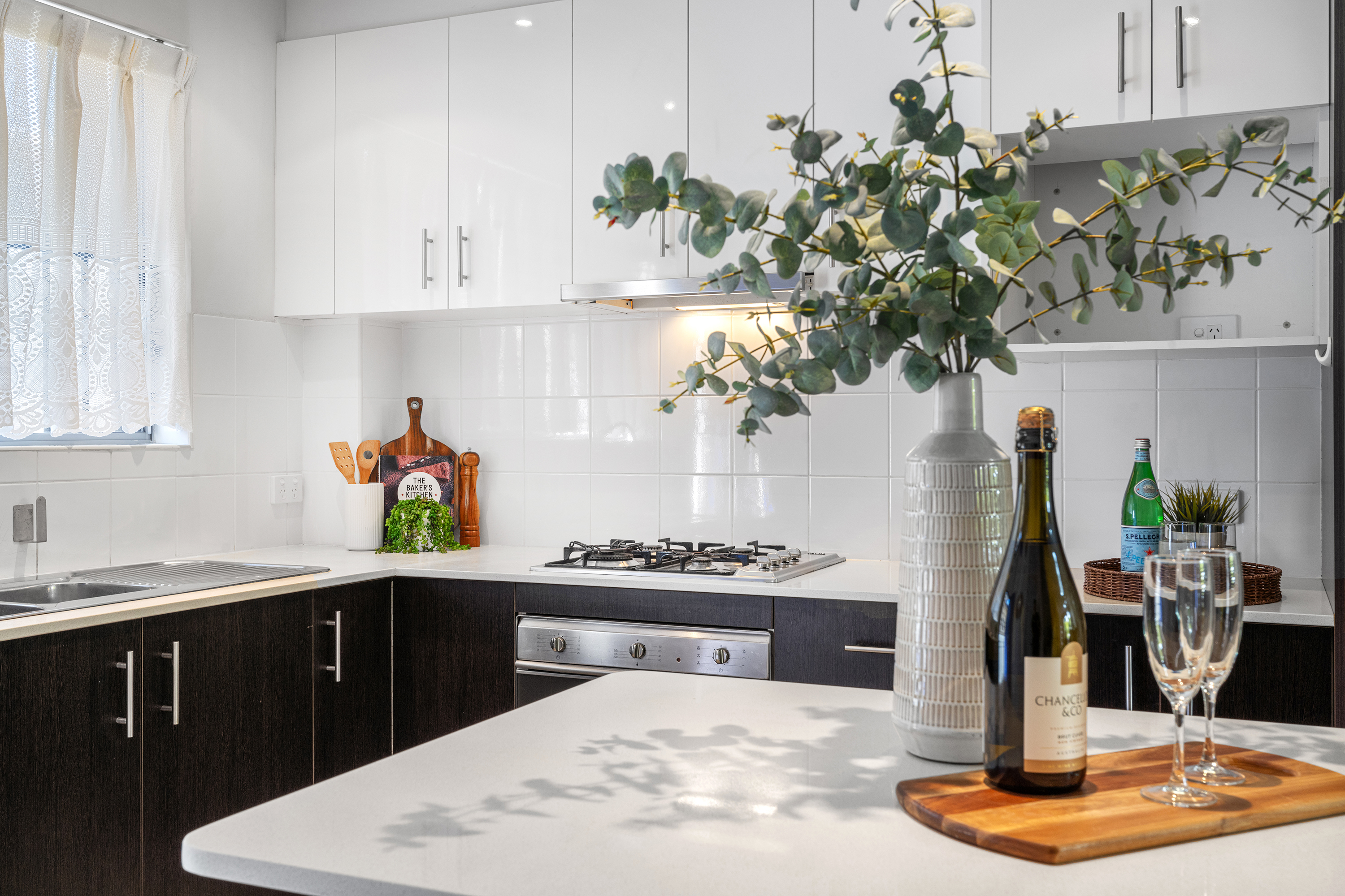 Modern kitchen with stone benchtops, ample storage, and quality appliances.